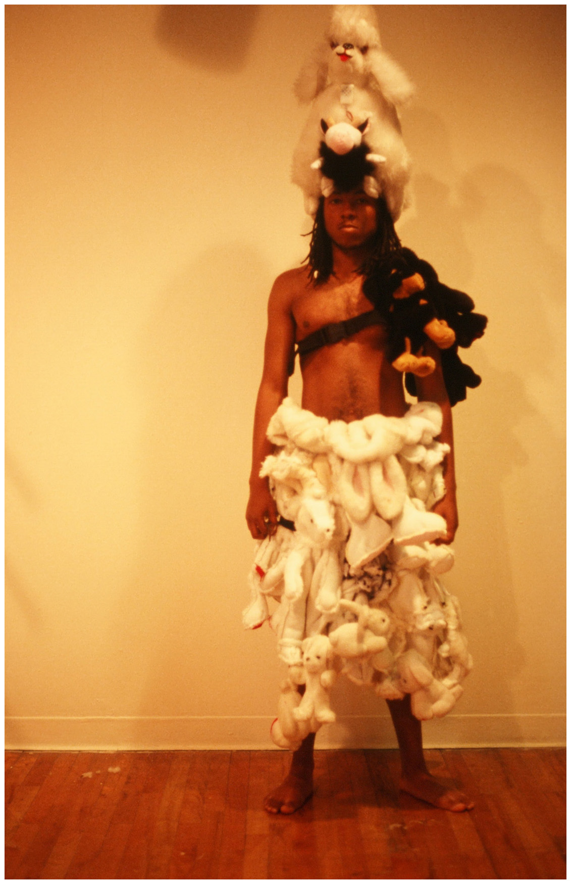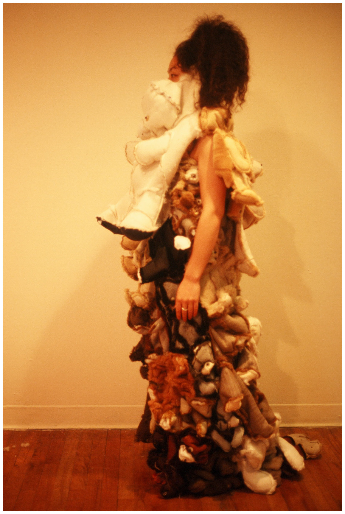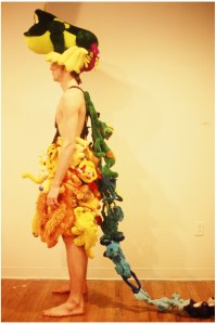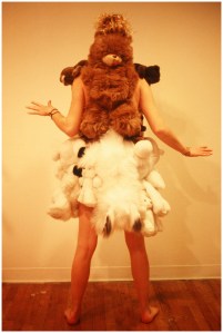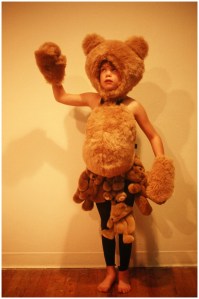 At age 7, Caroline became the unexpected star of a fashion show that I participated in at Pratt. My collection, and subsequent public performance (video stills below) was made entirely of stuffed animals (This was pre-Gaga, mind you, circa 2001.) The pieces reflected the intersection of Western consumerism and ancient traditions of mythology, spirituality and religion. Characters’ names ranged from the familiar Robin Hood to Tanana Woman. ‘Line’s character was Pisquajes, the Ojibwe name given to my father when he was a child. It means “tiny bubbles”.