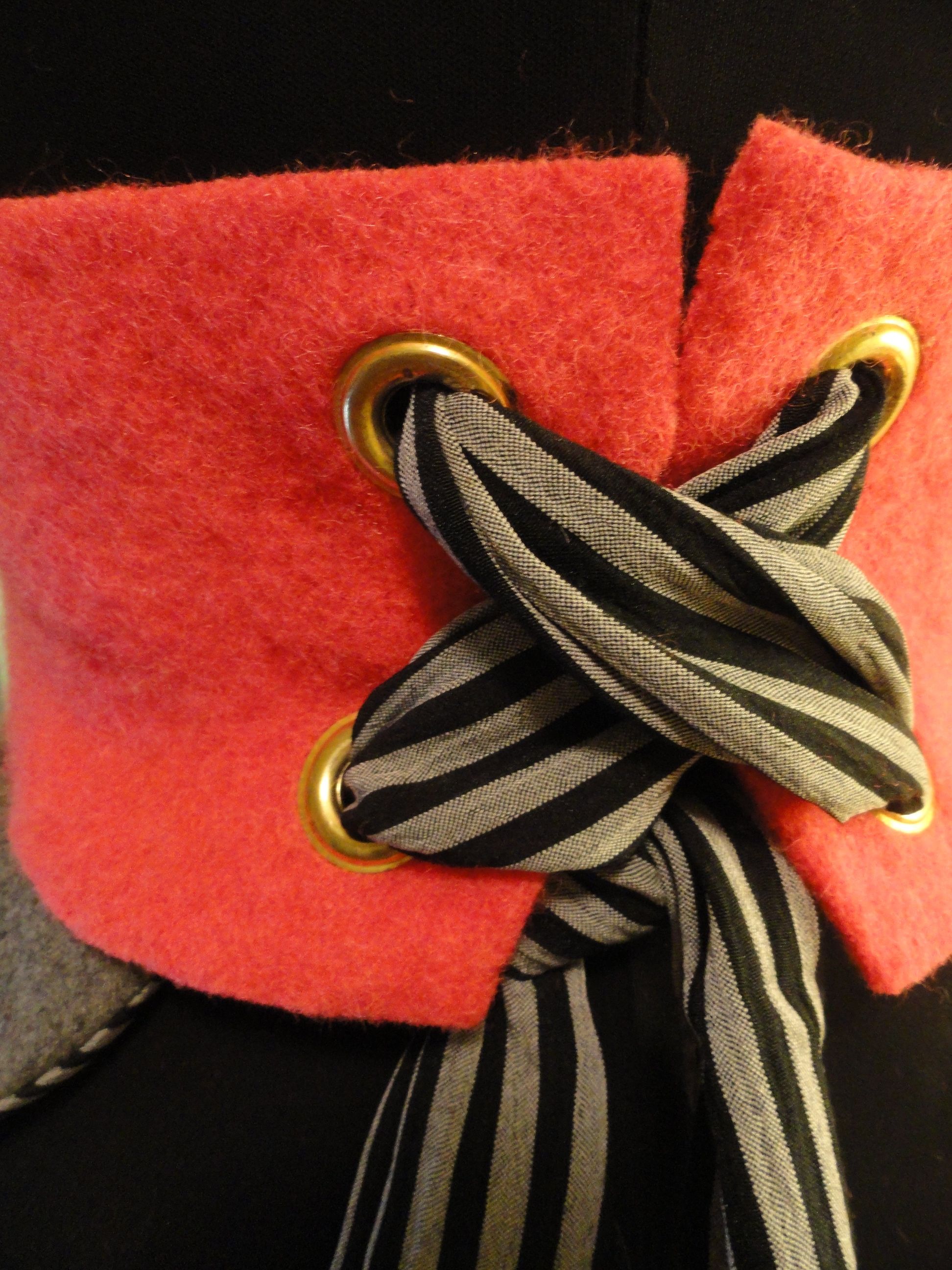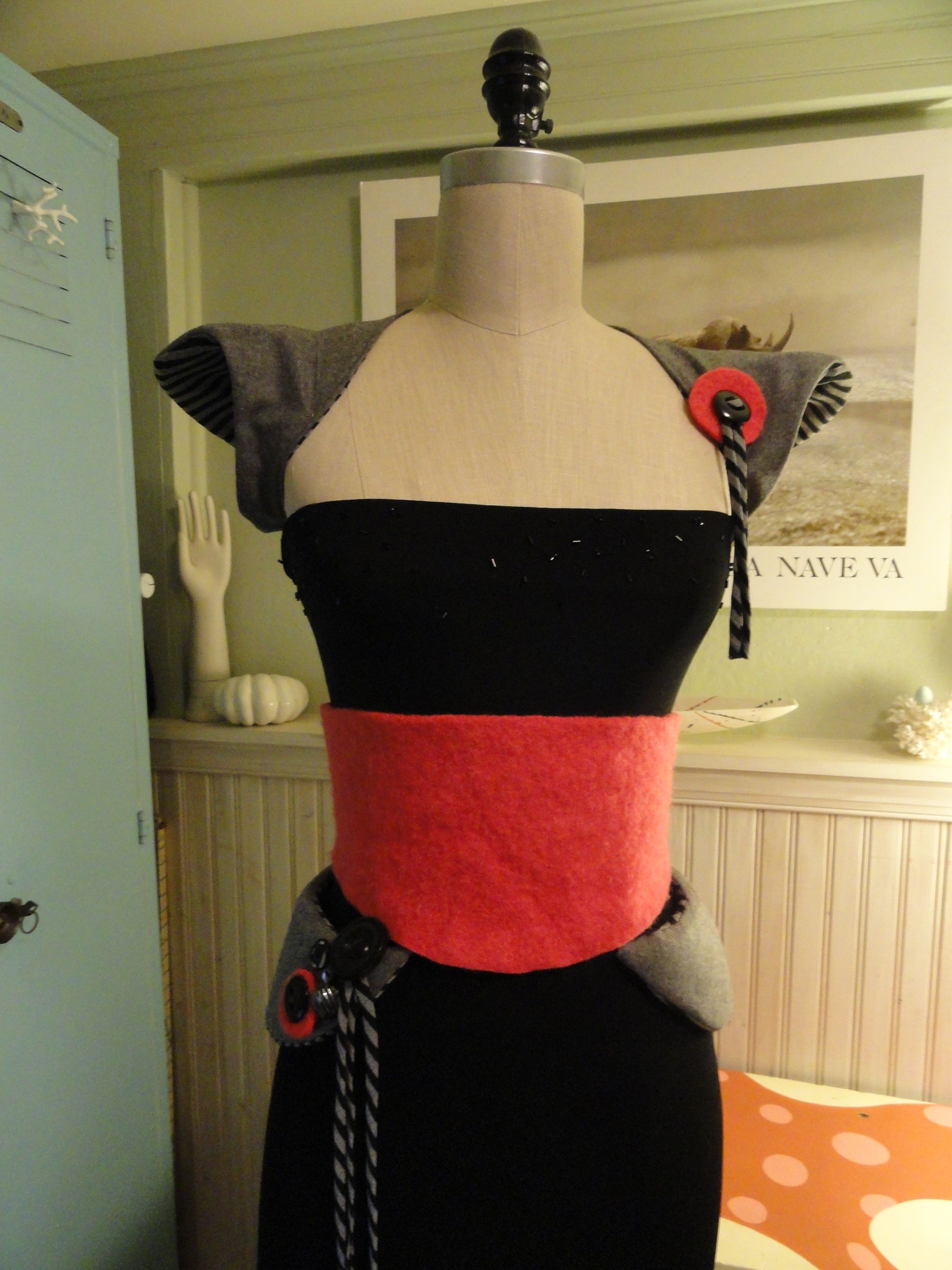 Made from altered second-hand dress, re-purposed wool pants, vintage buttons, felted wool sweater, thrifted shirt